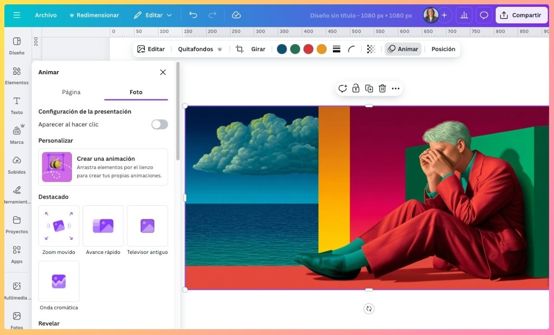 Canva AI te permite aplicar efectos de movimiento sin salir de tu panel de control de diseño. Basta con seleccionar un objeto y activar “Animate”. Quiero advertirte algo. Animar imágenes con IA en Canva solo sirve para crear movimientos simples, no para el tipo de animaciones que hemos estado viendo en esta entrada.
