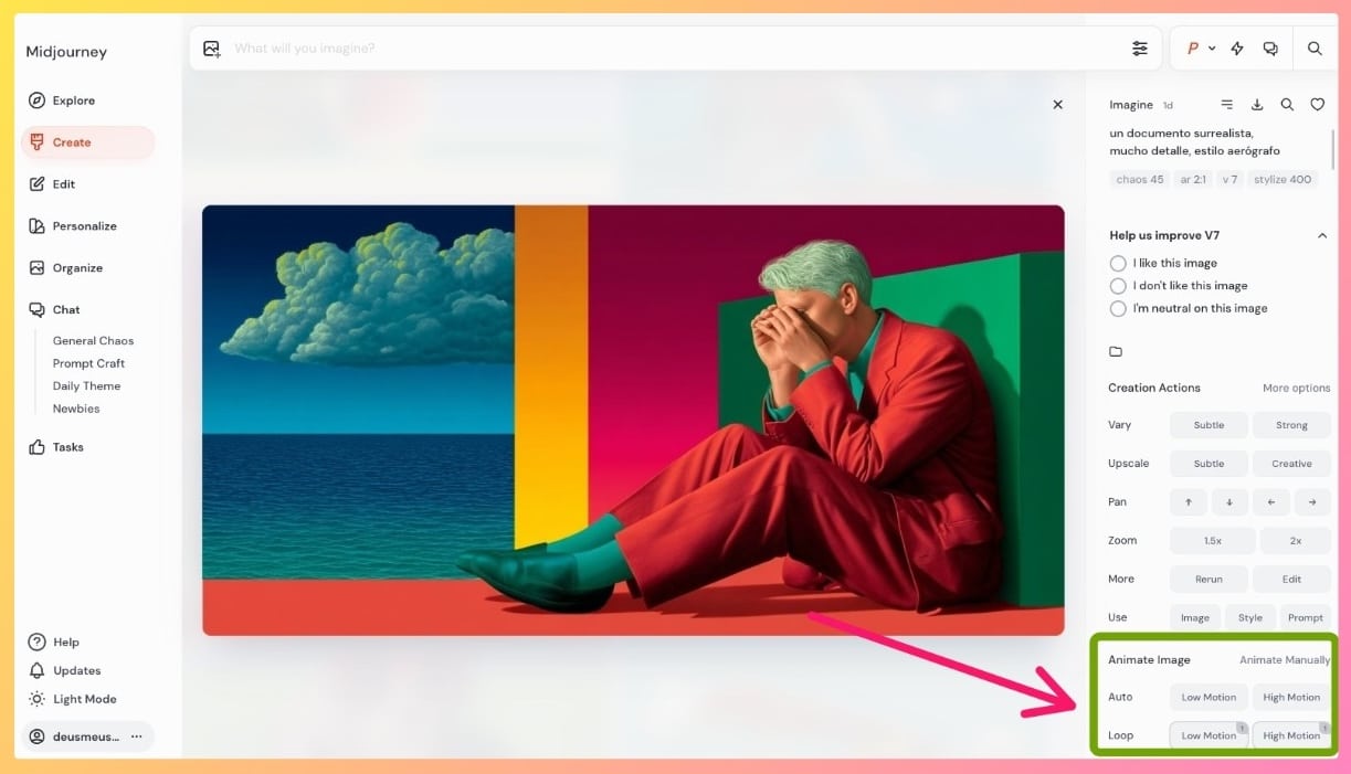 Por supuesto, también puedes ir a la versión web de Midjourney y hacer todo esto con escasos clics. Mira esta imagen.