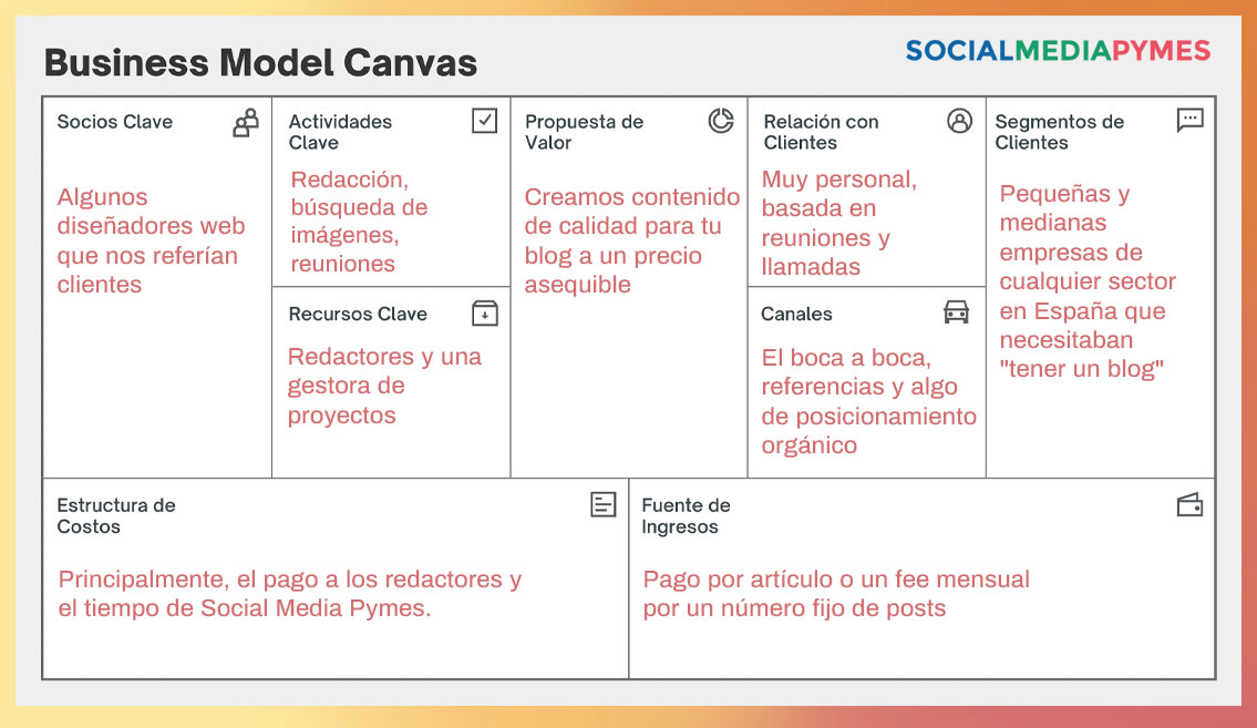 • Segmentos de Clientes: pequeñas y medianas empresas de cualquier sector en España que necesitaban «tener un blog».