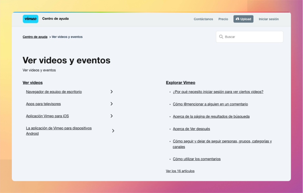 En este ejemplo de las preguntas frecuentes de la plataforma Vimeo, puedes ver cómo sí se cumplen muchas de las cuestiones de una auditoría que acabo de mencionar: dirige a los lectores a páginas clave dentro de la propia sección, la navegación es sencilla e intuitiva, tiene imágenes que ayudan a resolver las dudas el usuario y algo que veremos más adelante en el apartado de diseño, una caja de búsqueda visible.