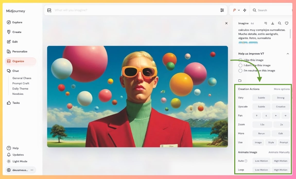 Para terminar, repasemos en esta guía de cómo usar Midjourney todas las herramientas que verás en el menú de la izquierda.