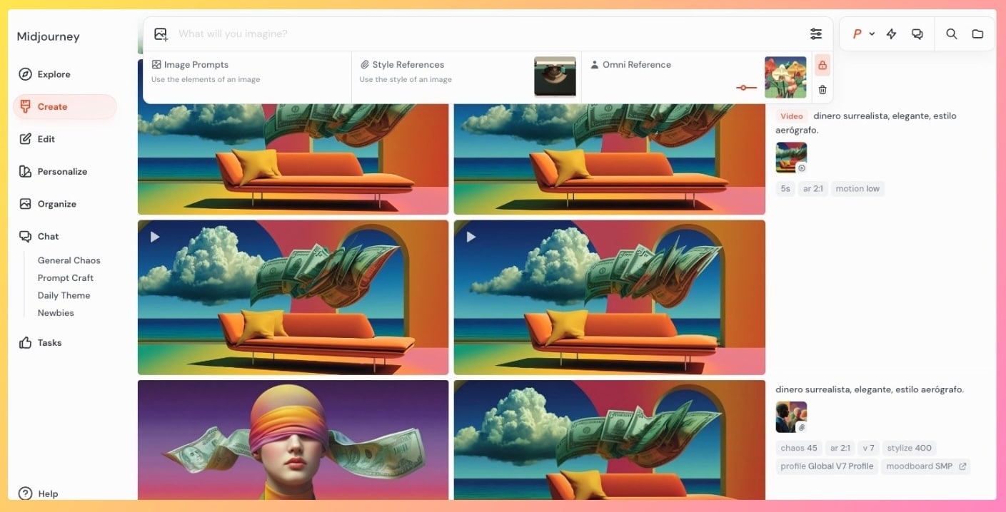 Desde agosto de 2024 también existe una interfaz web completa. Tras vincular tu cuenta de Discord en la web app, puedes iniciar sesión en el navegador y usar el “Imagine Bar” para generar imágenes, ajustar inpainting, ver galerías y conservar tu historial y ajustes sincronizados con Discord, sin necesidad de pasar por los canales de chat.
