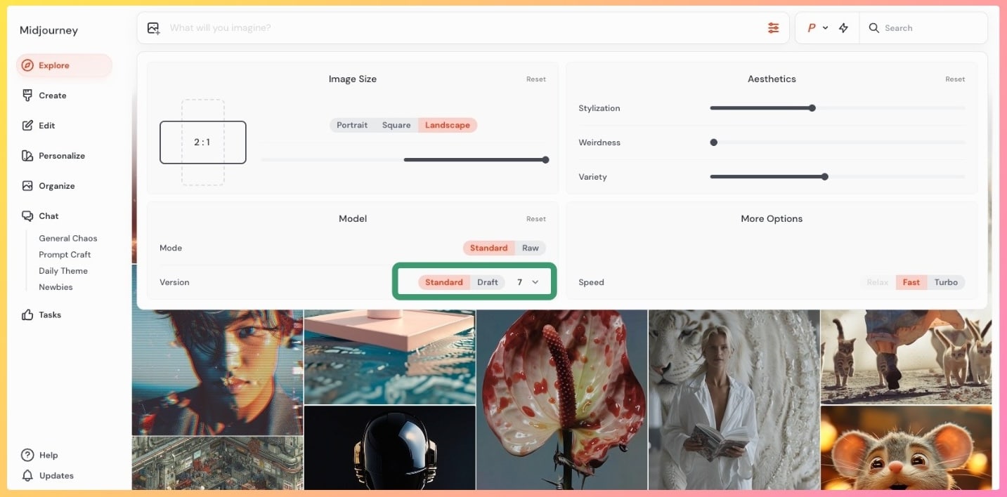 La barra de ajustes de la web de Midjourney es tu centro de control. Cada sección te permite afinar un aspecto clave de la generación. A continuación detallo en qué consiste cada parámetro y cómo aprovecharlo al máximo.