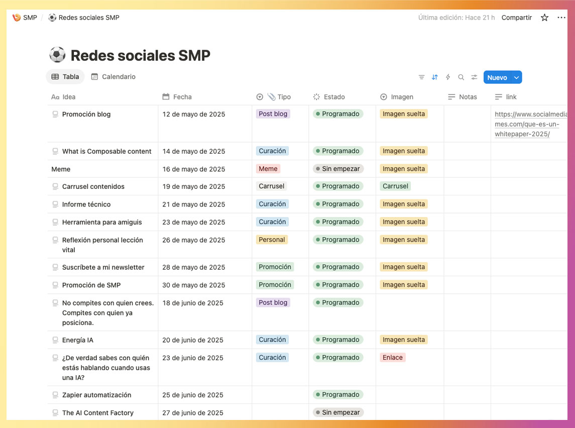 Truco: abre una plantilla en Notion para poder hacer un calendario de redes sociales rápidamente. En este ejemplo puedes ver cómo me organizo yo: defino el tema, el día de publicación, el tipo de contenido, su estado y lo que necesito diseñar.