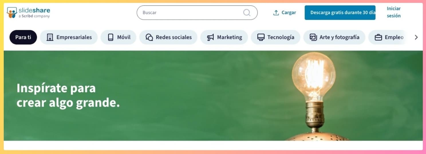 Centrada en la difusión de presentaciones, y con unos impresionantes 70 millones de profesionales como usuarios, esta aplicación recoge ya más de 18 millones de subidas en más de 40 categorías. Pero no solo de presentaciones vive Slideshare. También tienen cabida infografías, vídeos y series de imágenes.