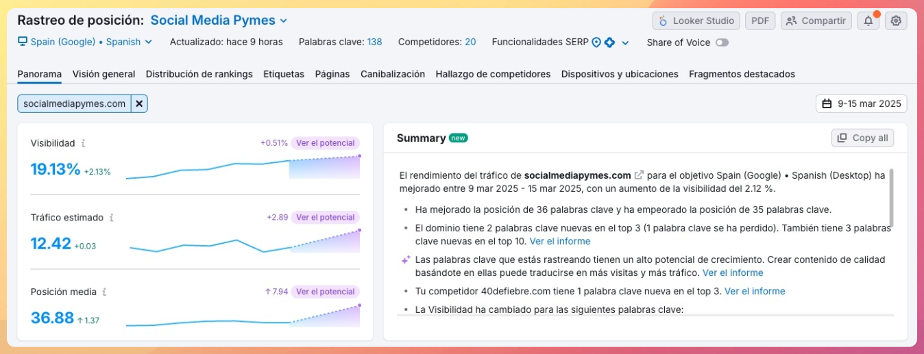 - Pros: los datos más completos del mercado, análisis de competencia brutal, seguimiento de posiciones, auditorías SEO.