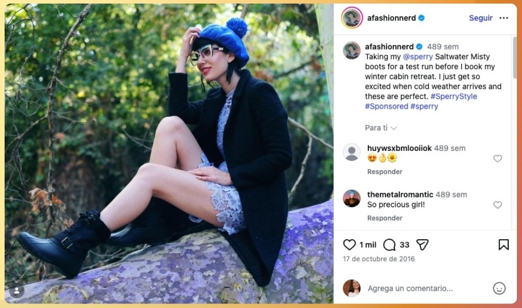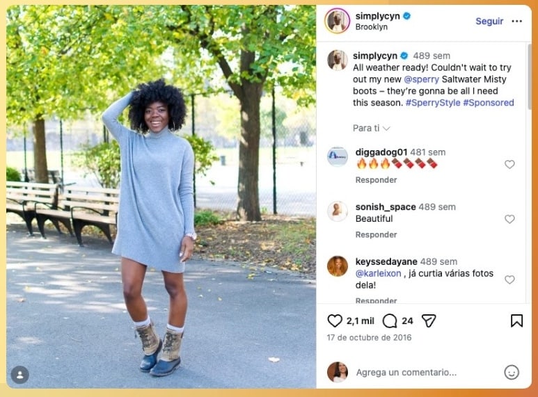 La primera fue una activación de pago de una semana de duración en la que influencers de moda con audiencias muy comprometidas publicaban diariamente mostrando cómo integraban la bota Saltwater de Sperry en su outfit of the day (#ootd). El criterio de selección no fue el tamaño de la audiencia, sino la autenticidad de la conexión de cada influencer con la marca y el nivel de engagement de sus seguidores.