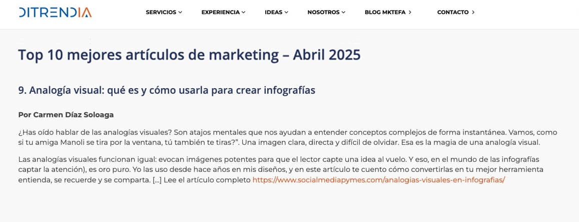 Entre los seleccionados figura en el puesto 9 un artículo de Carmen Díaz Soloaga, directora de Social Media Pymes, sobre el uso de analogías visuales para crear infografías efectivas, publicado en socialmediapymes.com.