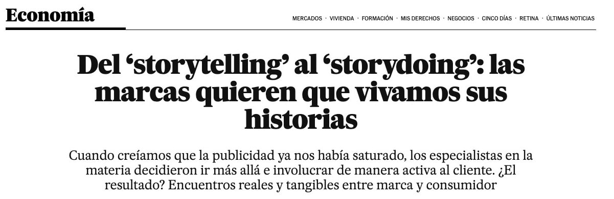 El artículo de El País aborda la evolución del marketing de contenidos desde el storytelling al storydoing: el paso de contar historias de marca a crear experiencias reales centradas en el cliente como protagonista.