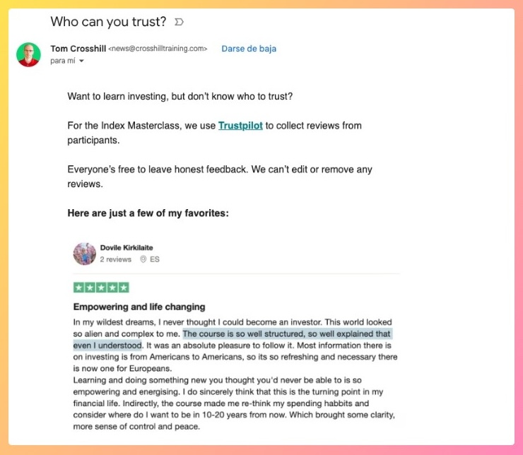 Hasta aquí mi relación con Tom Crosshill que así es como se llama el emprendedor que ofrece estos servicios. En cuanto supe el precio del curso sobre inversiones, se acabó mi interés en el tema.