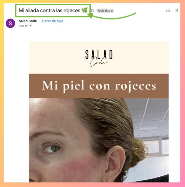 Por ejemplo, si tienes dudas sobre qué poner en el asunto al mandar un correo aquí tienes un correo que nunca hubiera abierto, porque las rojeces no están entre los problemas de mi piel. No culpo a Salad Code por mandarme un correo sin personalizar, aunque sí soy clienta de esta marca y quizás podrían haber conseguido información sobre los problemas de mi piel y mandarme un correo que fuera relevante para mí.